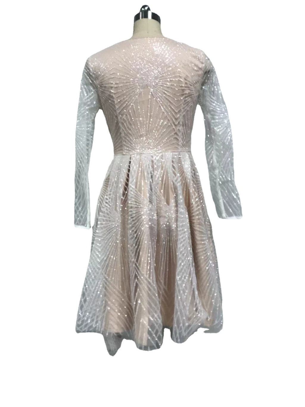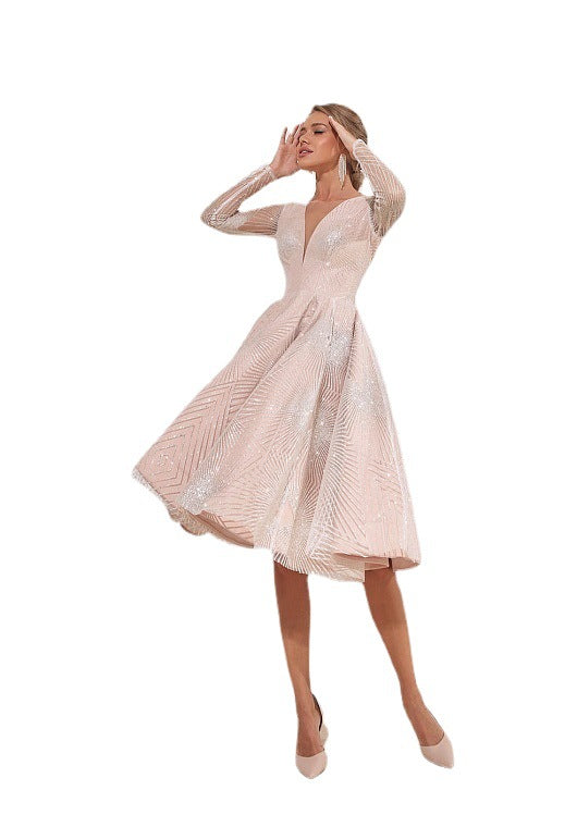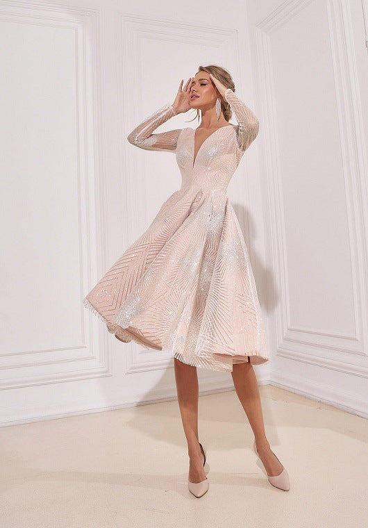 V-Neck Cocktail Dress with mesh Sleeves and Midi Hem
