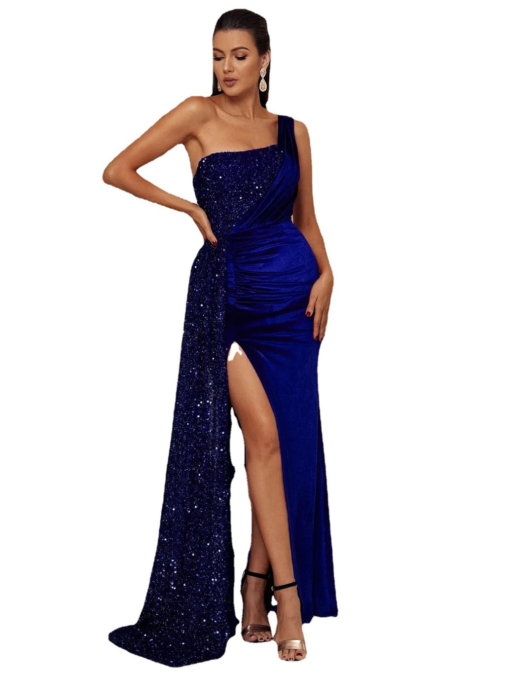 This stunning gown will make you feel like royalty. Full of high-octane glamor, it is made with a one-shoulder neckline, single shoulder strap and a fitted bodice that continues down to a hip-accentuating skirt with ruching for creating an hourglass look, complemented by a sexy thigh-high slit that helps to make your legs appear longer. What makes this gown stand out is the attached sequined duster that pools at the floor, lending elegance to your every step and adding just the perfect touch of sparkle to your look. A concealed zipper closure at the back ensures an easy on and off.