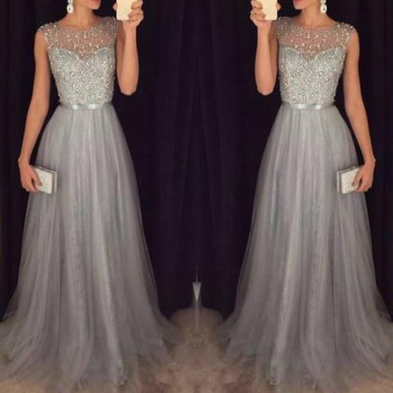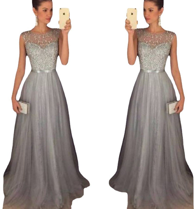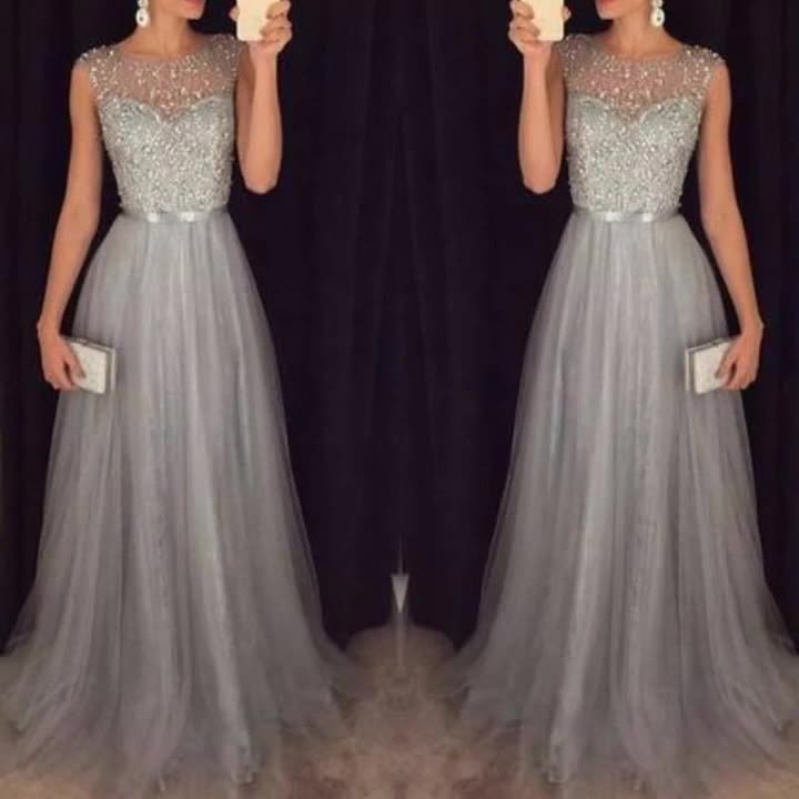 Obtenha o visual clássico da princesa usando o decote feminino, maxi ombre, vestido cinza com corpete puro. Possui um corpete de malha com pontos de detalhes prateados que combinam com o resto do vestido lisonjeiro.