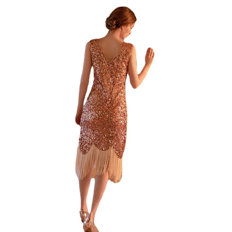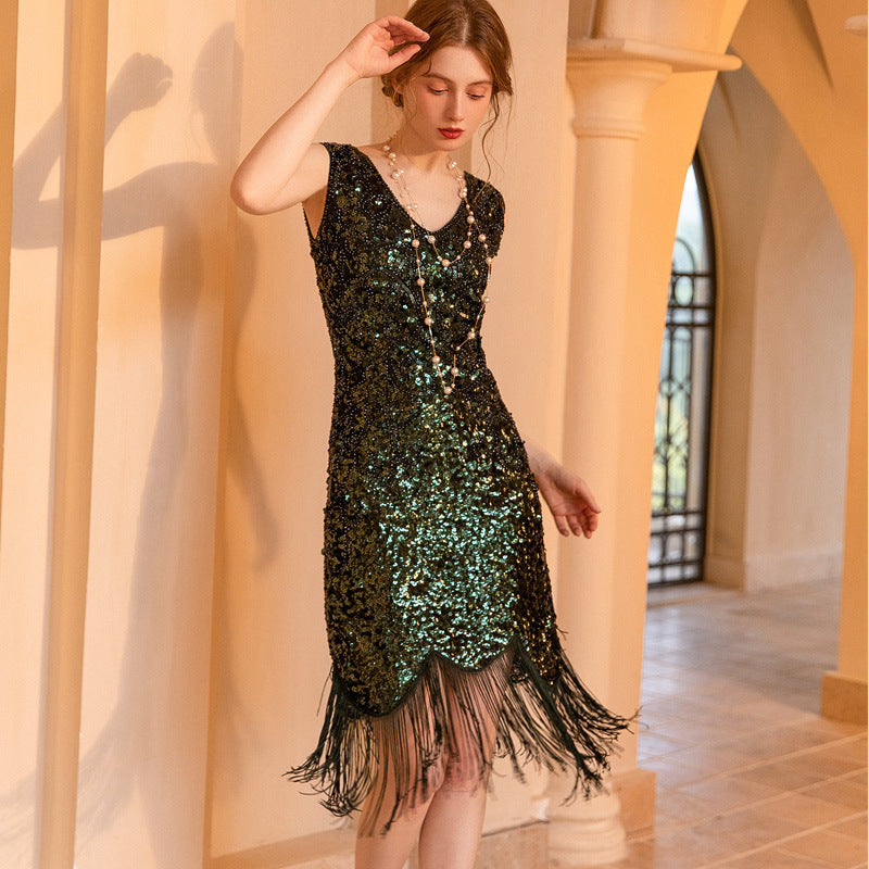 Inspire -se na década de 1920, vestindo o mini vestido de lantejoulas e borla de borla, que apresenta lantejoulas cintilantes e vem na sua escolha de cores.