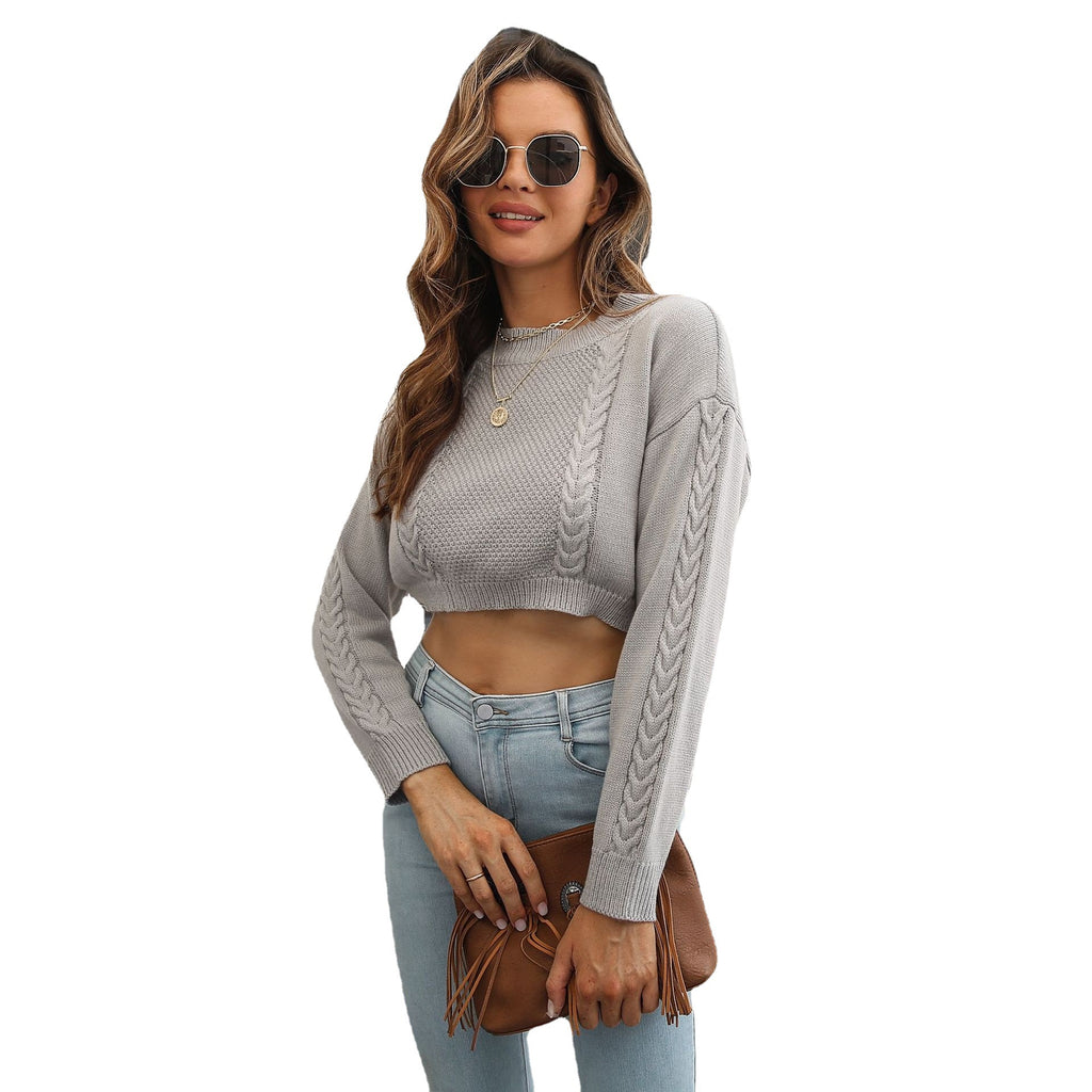 Reinvente o suéter clássico usando o suéter de mangas compridas femininas com desenhos de malha com padrões de malha de seta na frente e as mangas. Escolha entre uma das três cores.