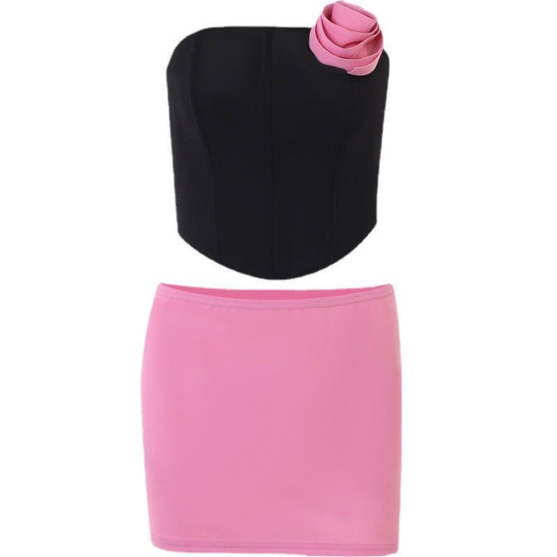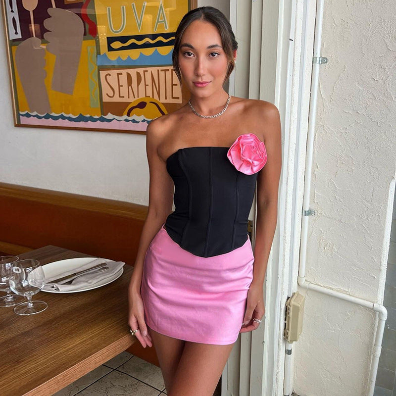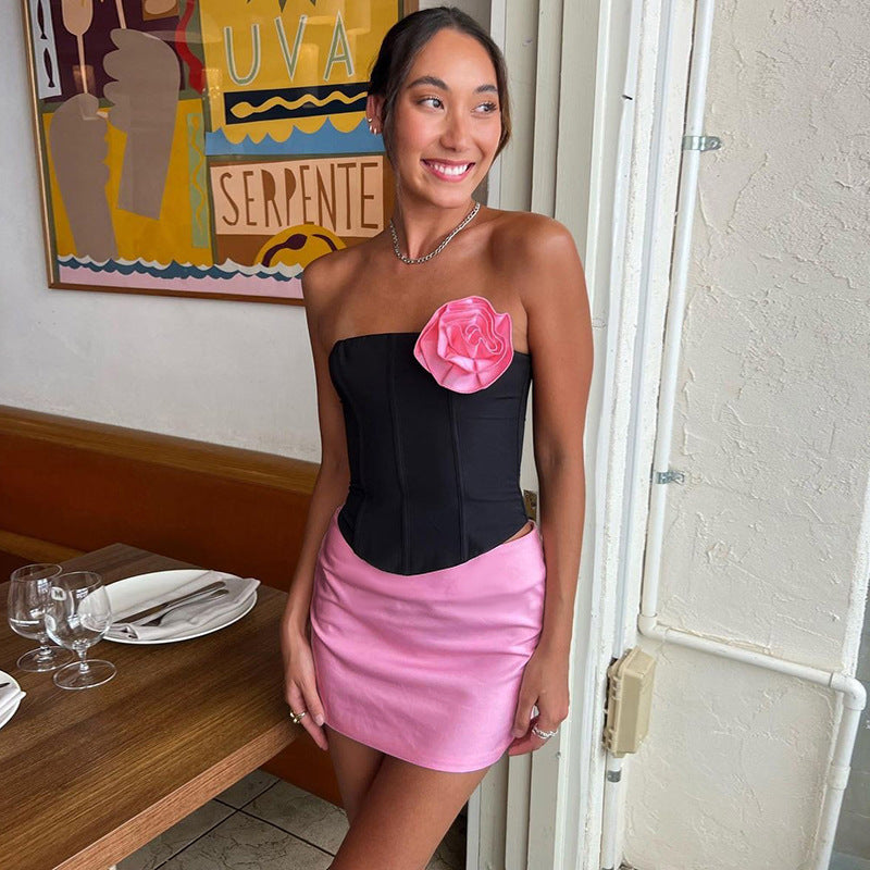Flirty e Chic, o tampo de haltera e a saia de duas peças das mulheres é a escolha perfeita para brunches e datas de almoço. Possui um esquema de cores preto e rosa completo com um detalhe floral rosa no ombro.