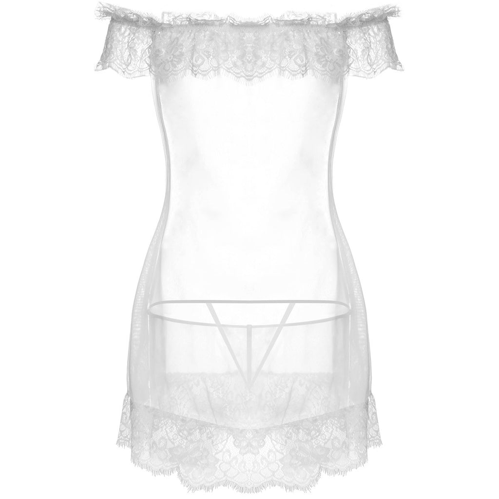 As mangas rendadas fora do ombro e o acabamento rendado do vestido de lingerie fora do ombro são conectados pela malha ajustada de forma que lisonjeia sua forma.