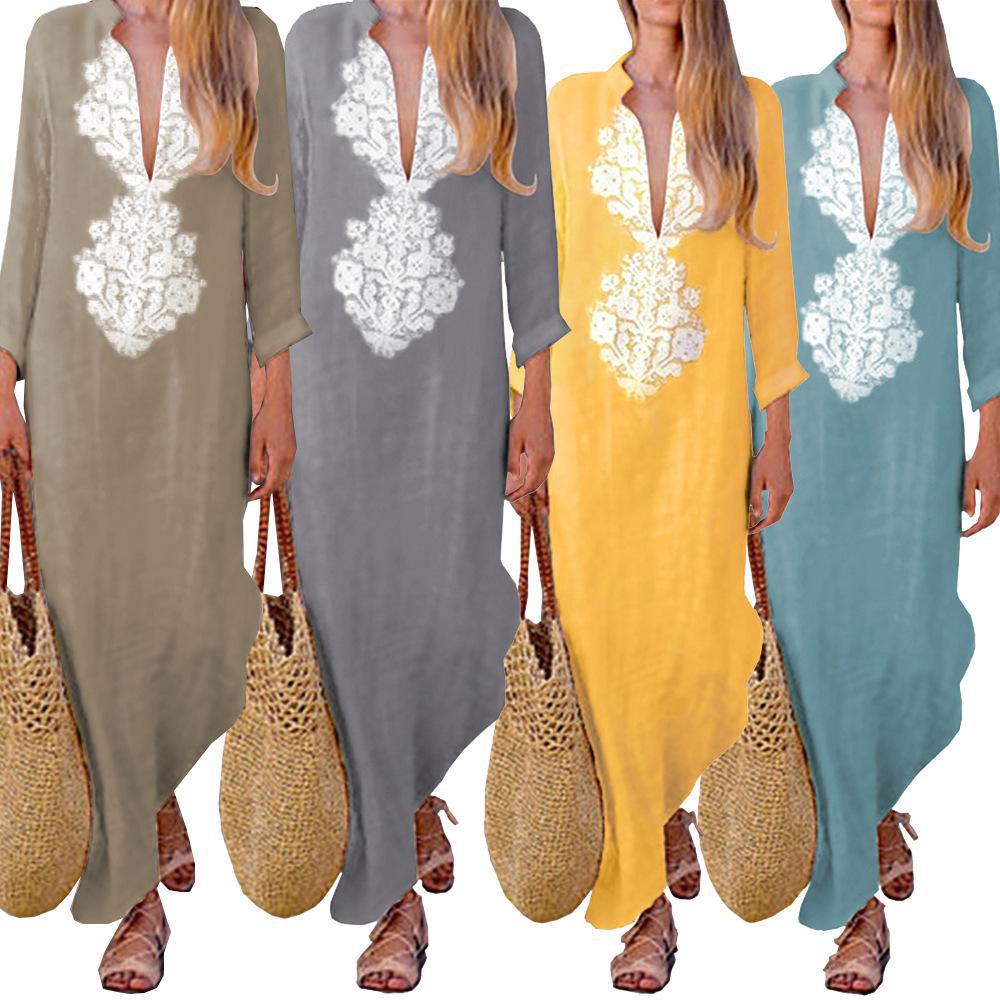 Perfeito para dias de verão arejados, o vestido maxi de decote em V de manga longa e colorida é leve e colorida. Possui um padrão artístico na frente, interrompido artisticamente pelo decote em V.