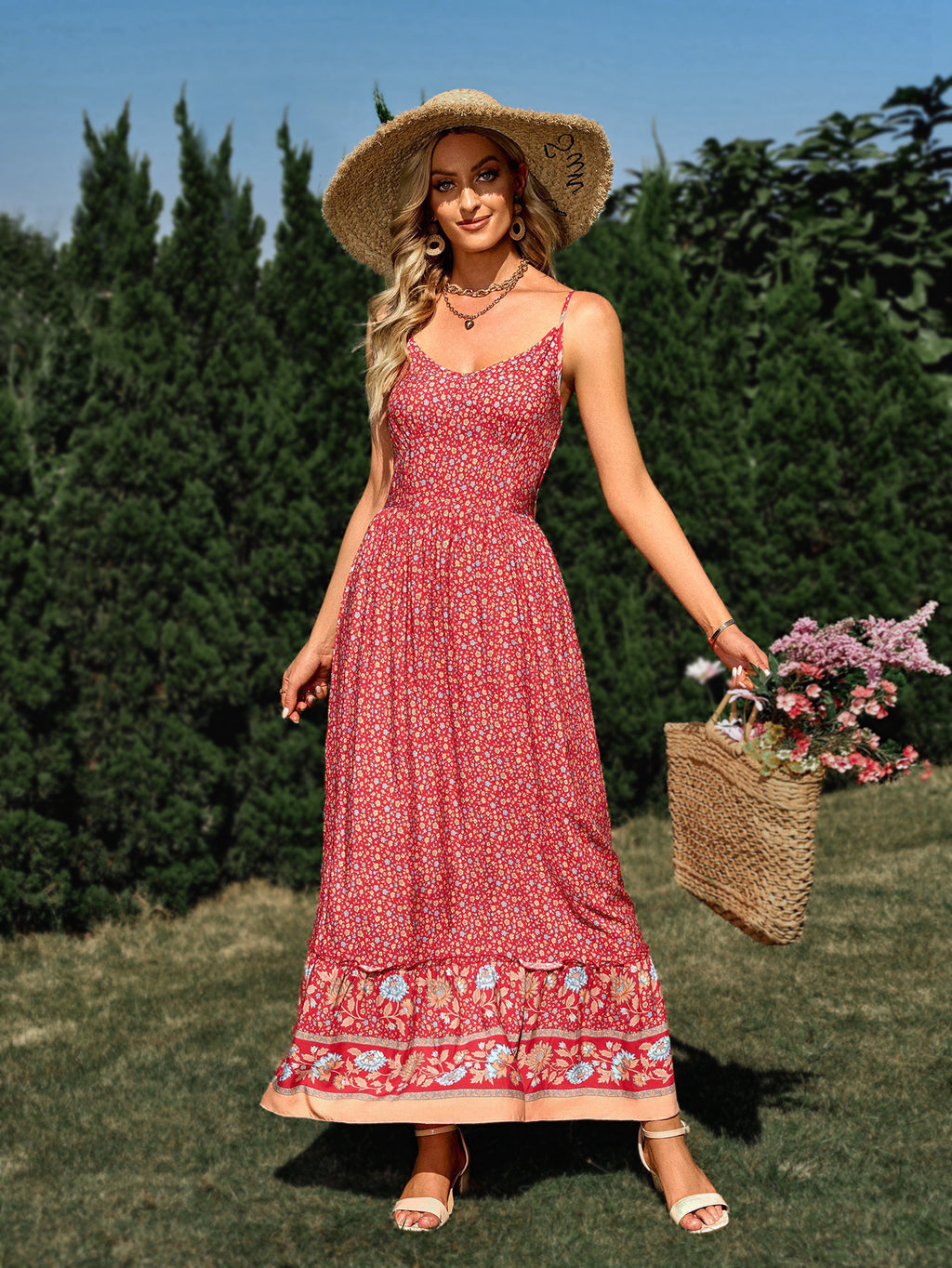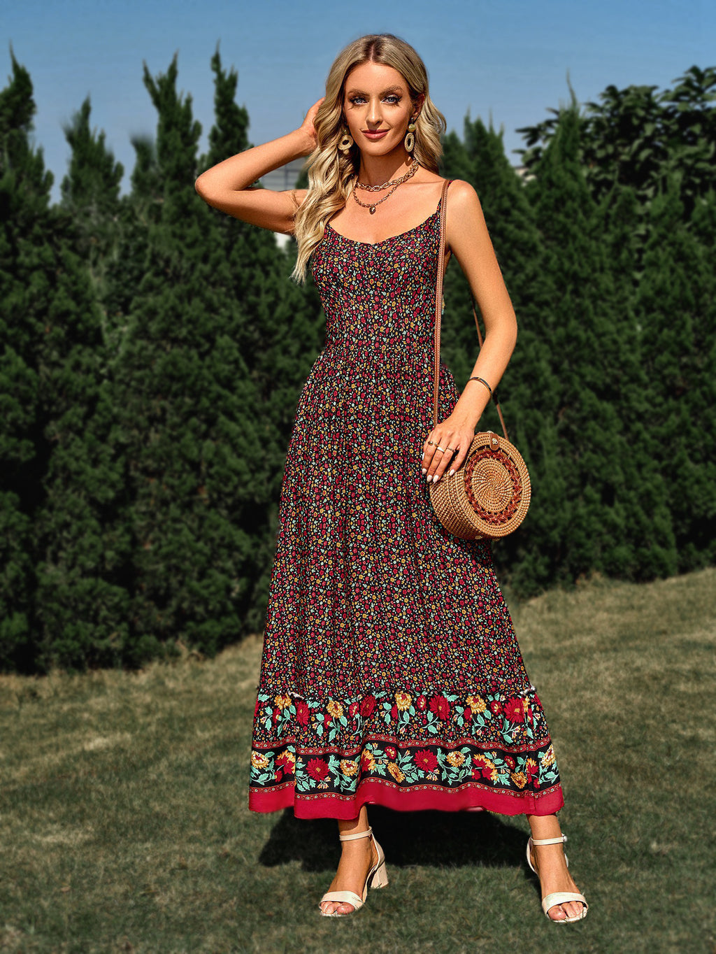 Olhe o seu melhor em passeios casuais usando o vestido maxi estampado de pulseira de espaguete feminino. Este vestido vem em uma das três cores e apresenta detalhes inspirados em Paisley ao longo da bainha.