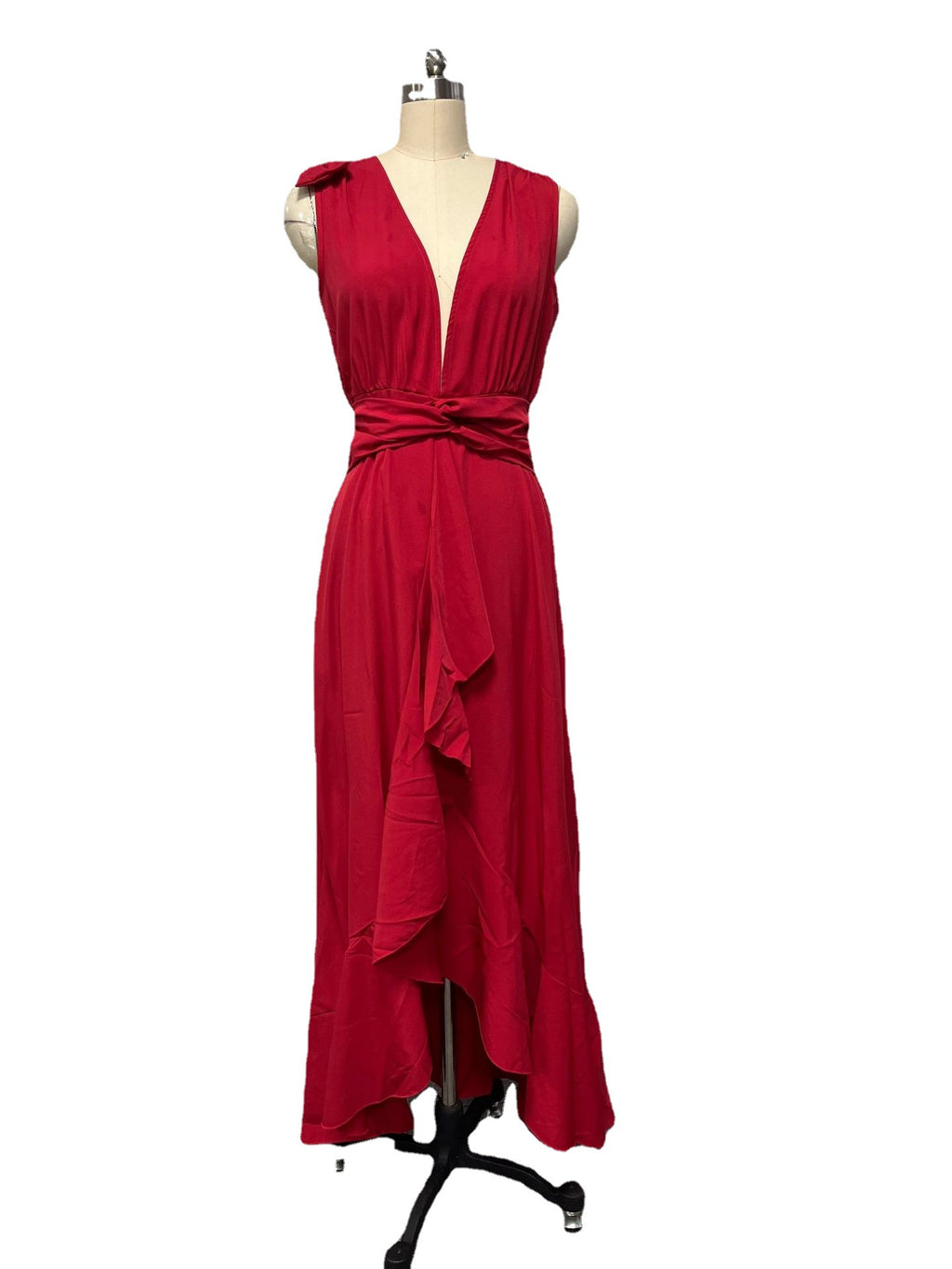 無袖領帶腰部長裙與hi-lo下擺