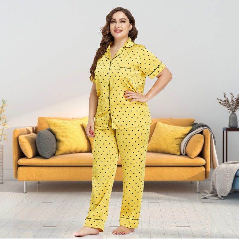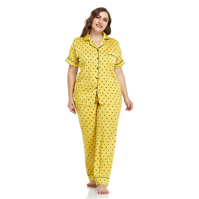 在這個可愛的女子的兩個圓點領襯衫和褲子睡衣套裝中,舒適地過夜,其中包括柔滑的材料和鈕扣。它們有藍色或黃色的選擇。