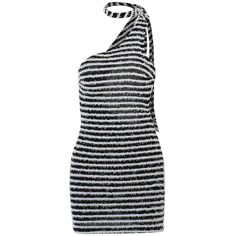 用這個女人的肩膀黑色和白色條紋連衣裙打扮成夏天的衣櫃,脖子周圍有獨特的領帶和迷你下擺的長度。