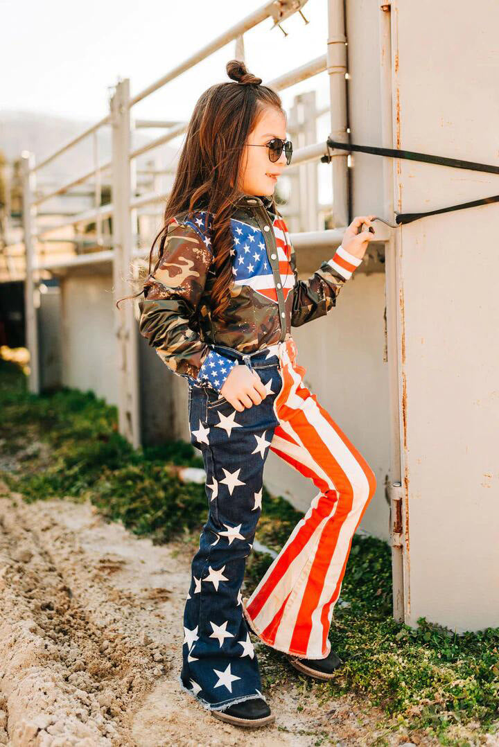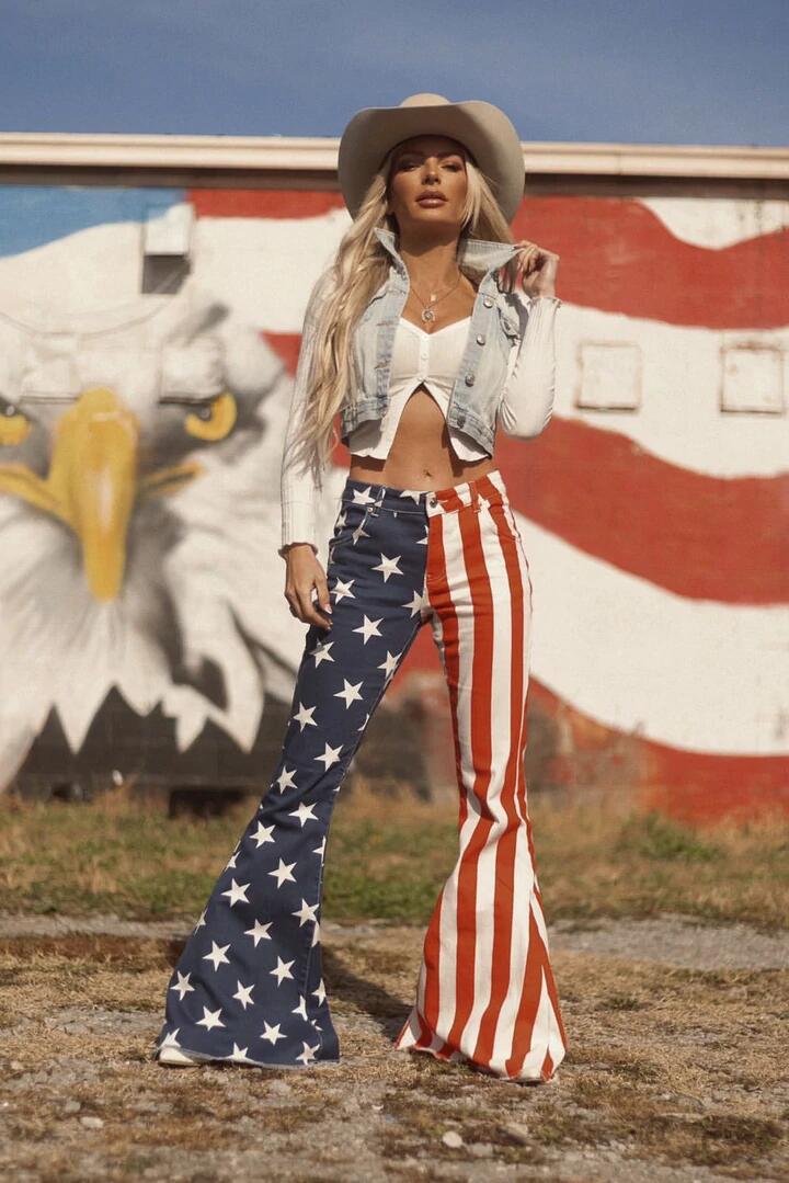 紅色白色和藍色星星和條紋喇叭牛仔褲