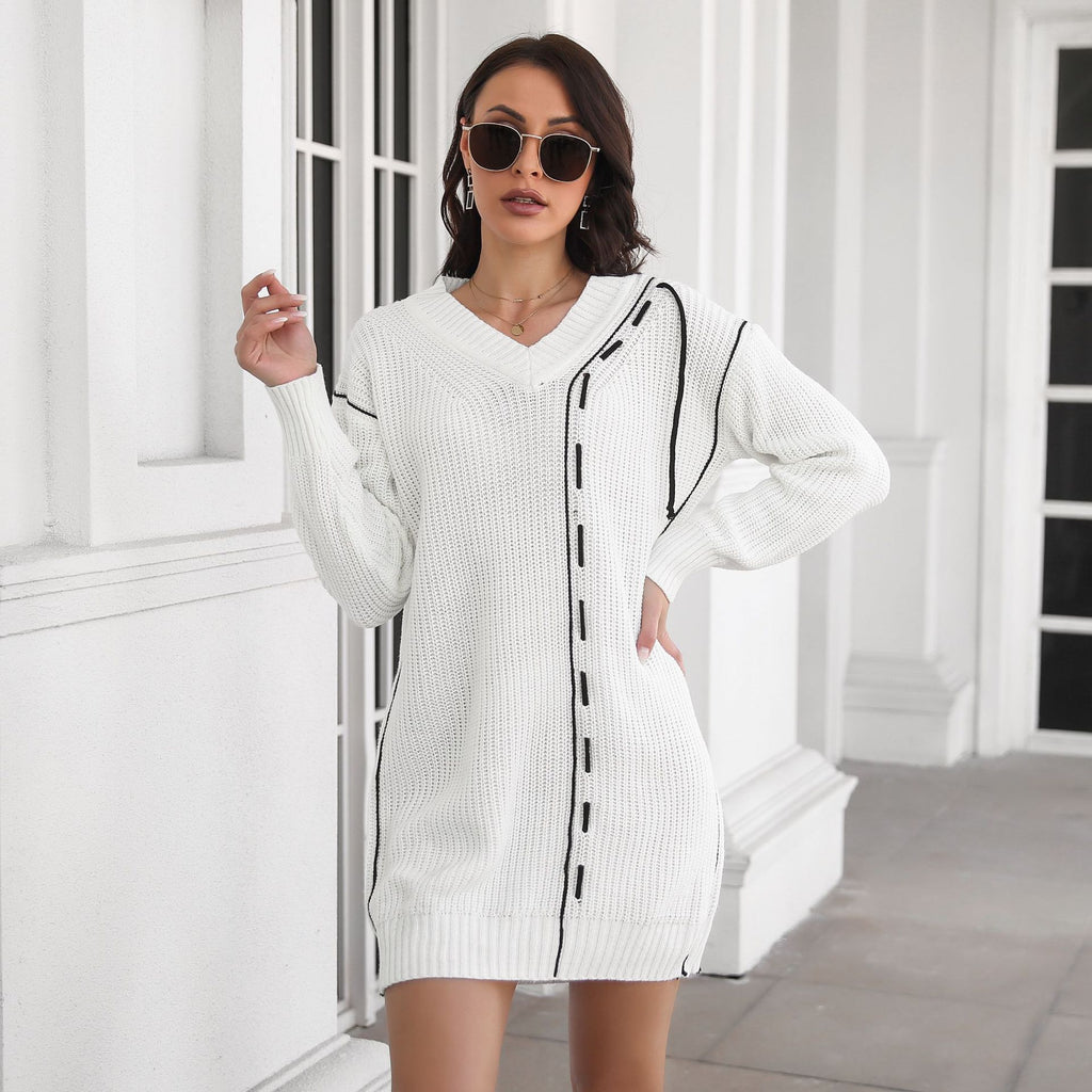 這款女士球衣啟發的運動型長袖毛衣連衣裙是一種運動,是一種誘人而可愛的衣服。它具有沿毛衣曲線的V領和對比度縫線。