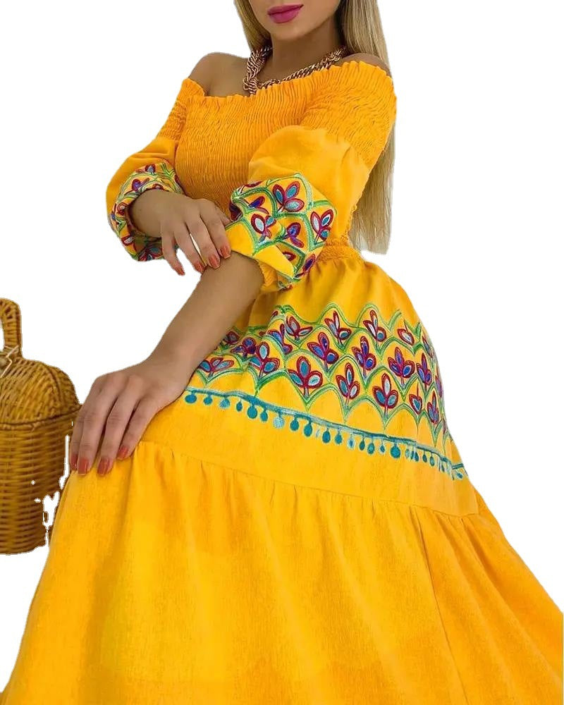 穿著這款女士墨西哥風格的這種鮮豔的禮服,帶有三分之一長的袖子。它具有下擺,大腿和袖子周圍的植物裝飾。