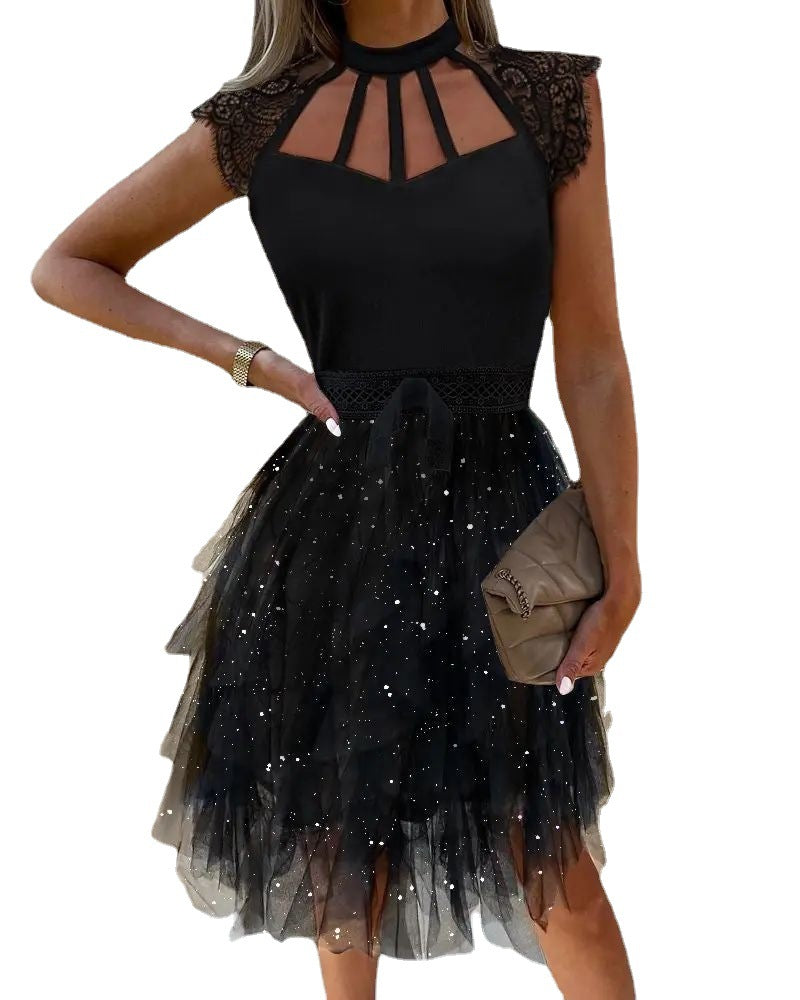 炫耀自己的大膽個性,穿著這款女士短蕾絲袖子迷你連衣裙,配以芭蕾舞短裙。它具有獨特的領口,包括三條皮帶,延伸到包裹在脖子上的織物螺絲領子上。