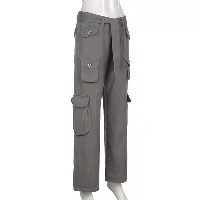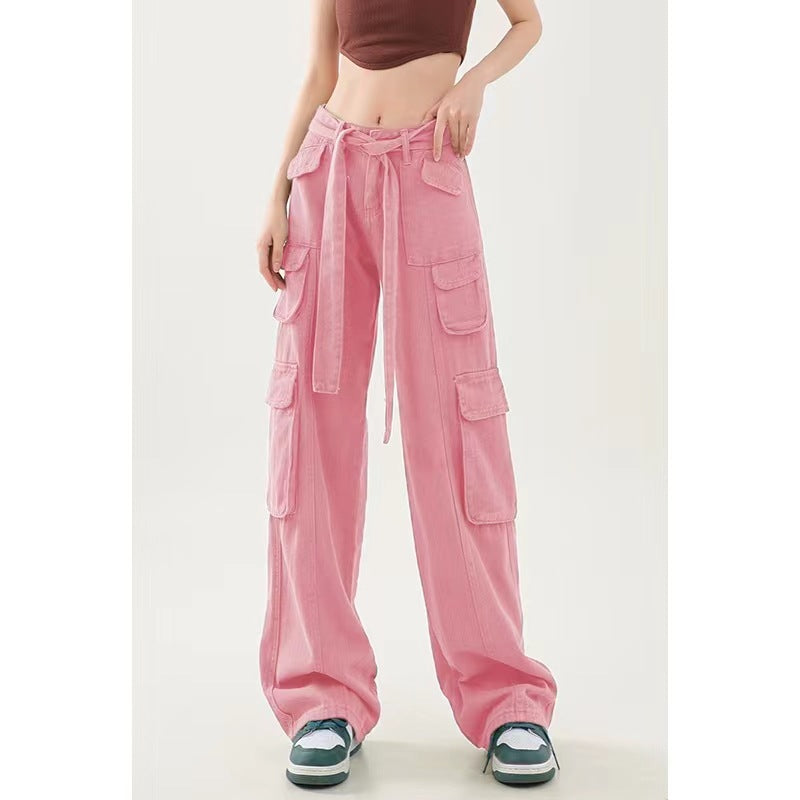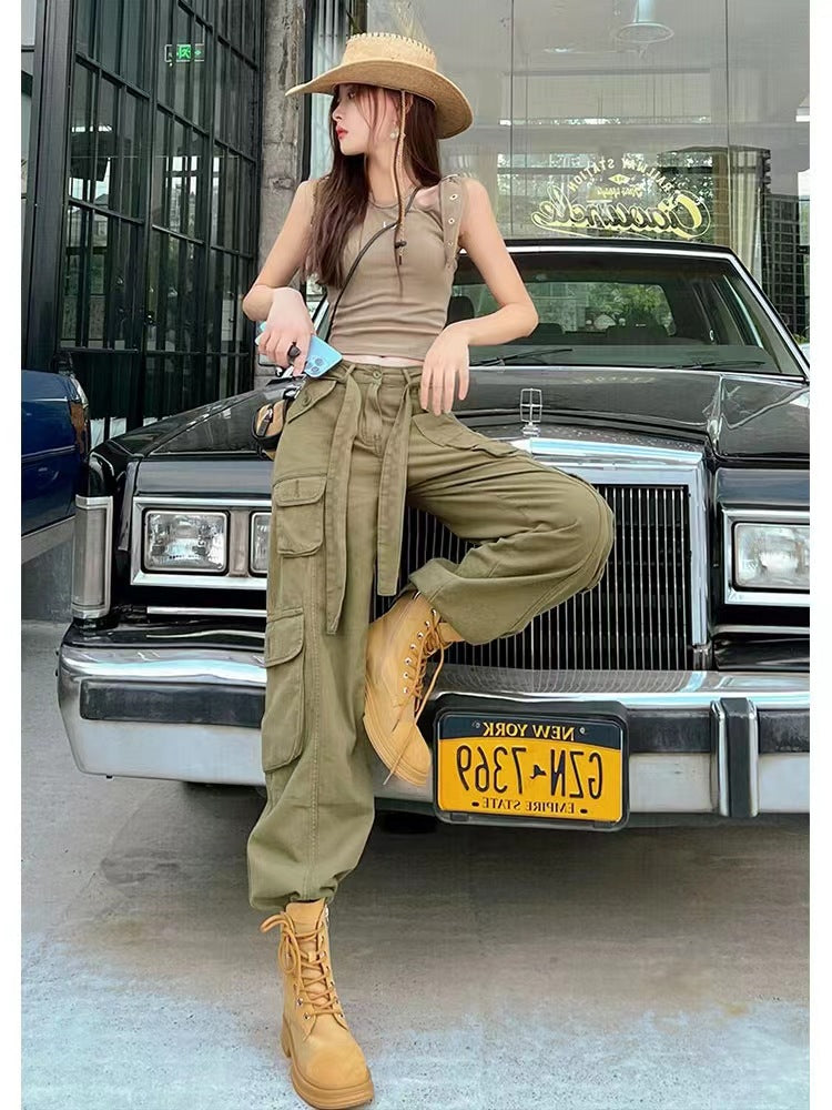 Women’s High Waist Loose Fitting Pants with Cargo Pockets and Tie Waist