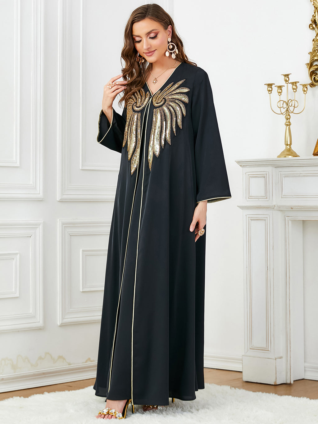 Feel like royalty in the Women's Long Sleeve Loose Fitting Navy Blue Robe Dress accented with shimmery golden details and matching gold trim.