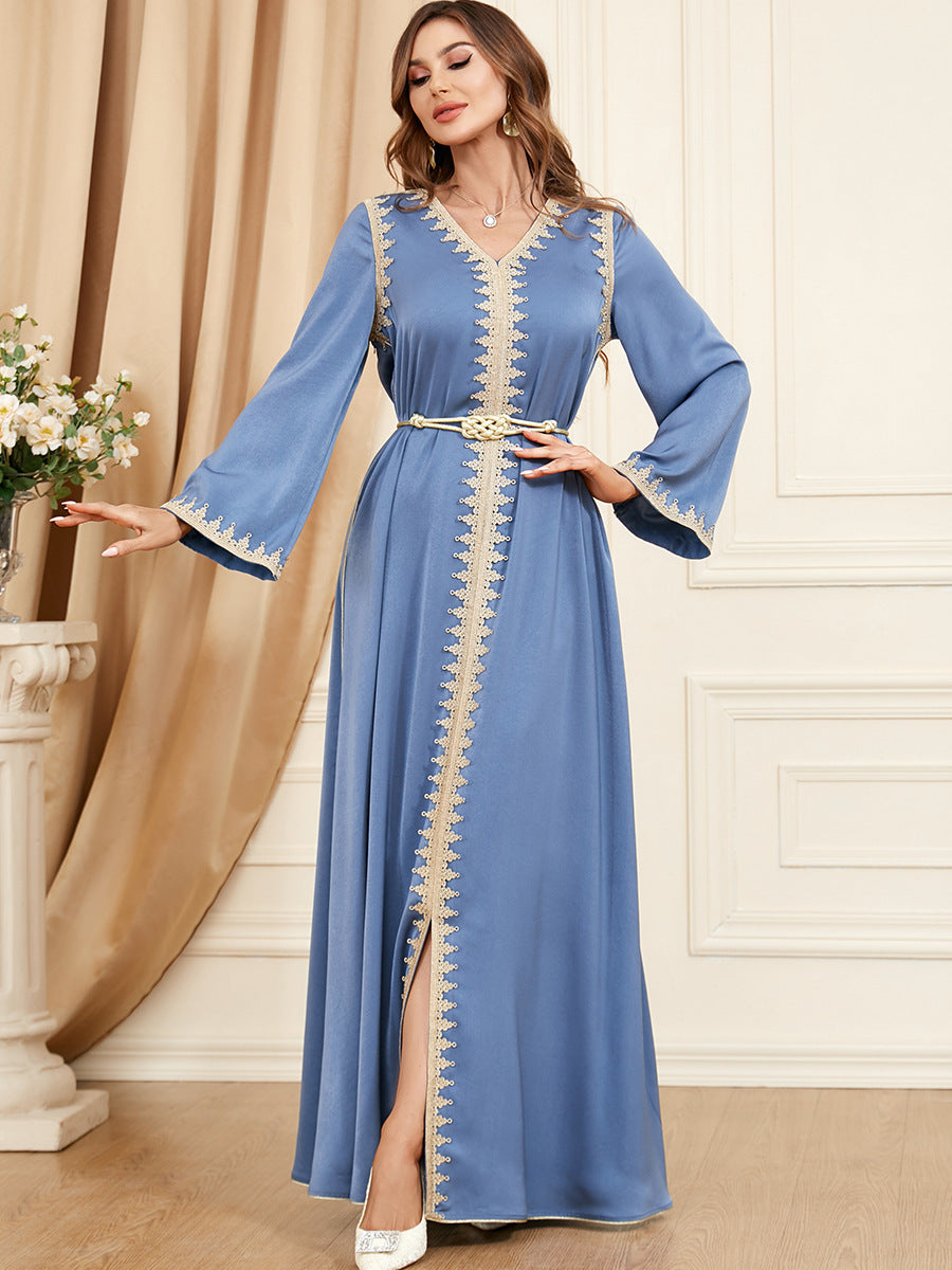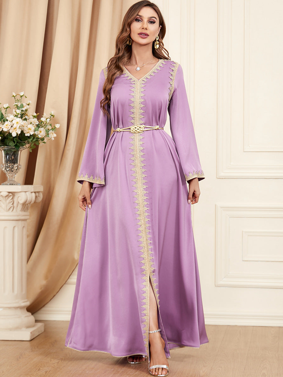 Complete your nighttime wardrobe with the Women's Long Sleeve Loose Fitting Soft Maxi Dress that features eye-catching gold detailing and trim.