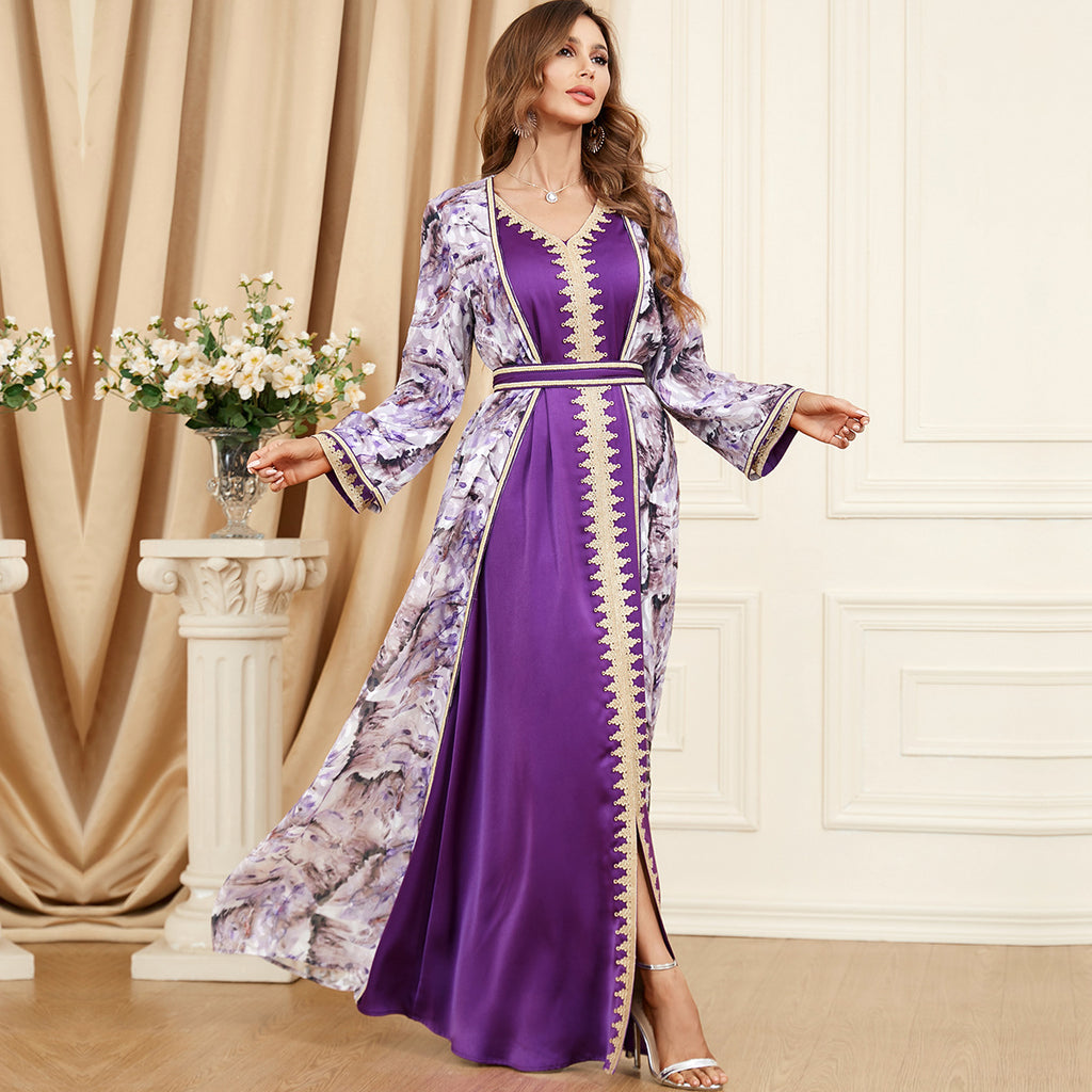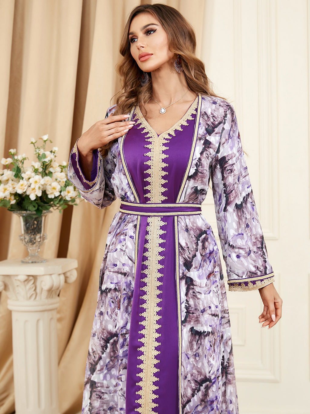 Women's Long Sleeve Purple Maxi Dress with Golden Trim