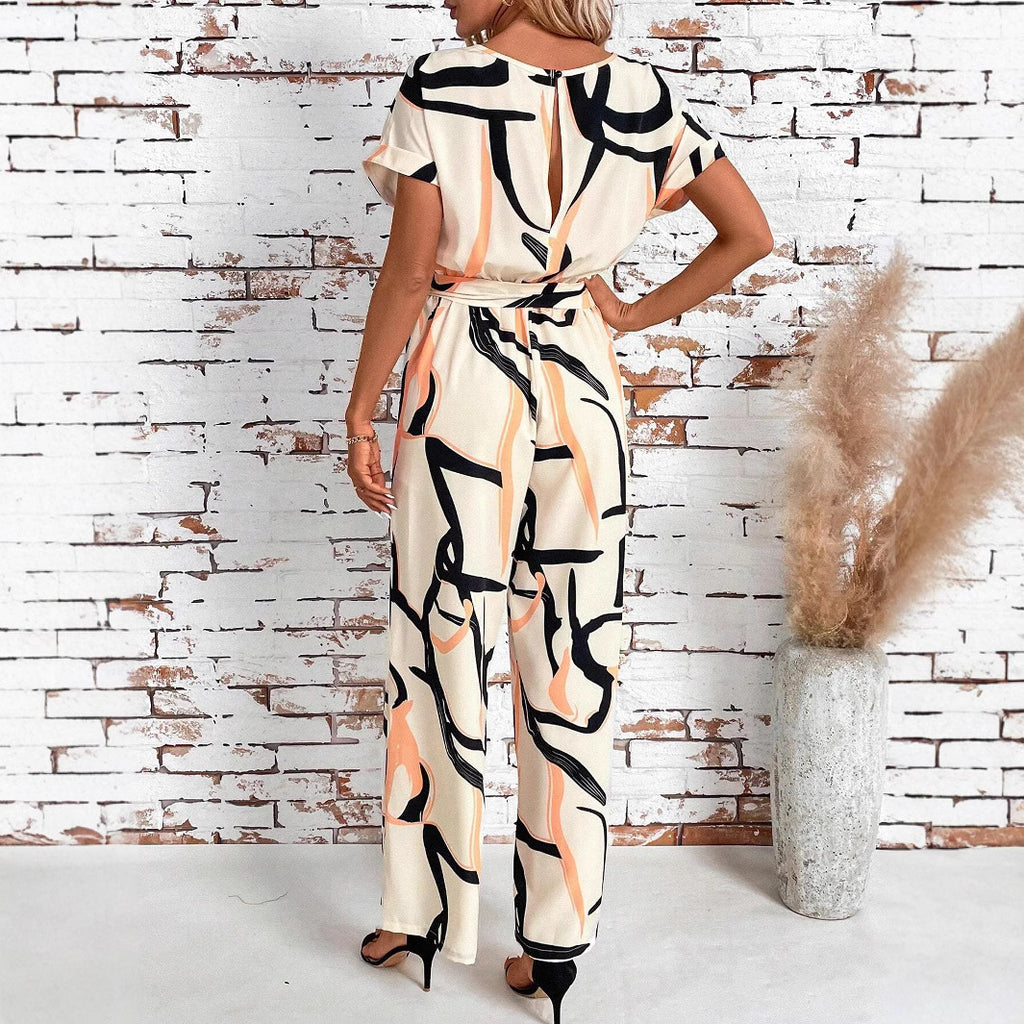 Women's Retro Waist-Cinching Figure-Flattering Elegant Short-Sleeve Printed Jumpsuit