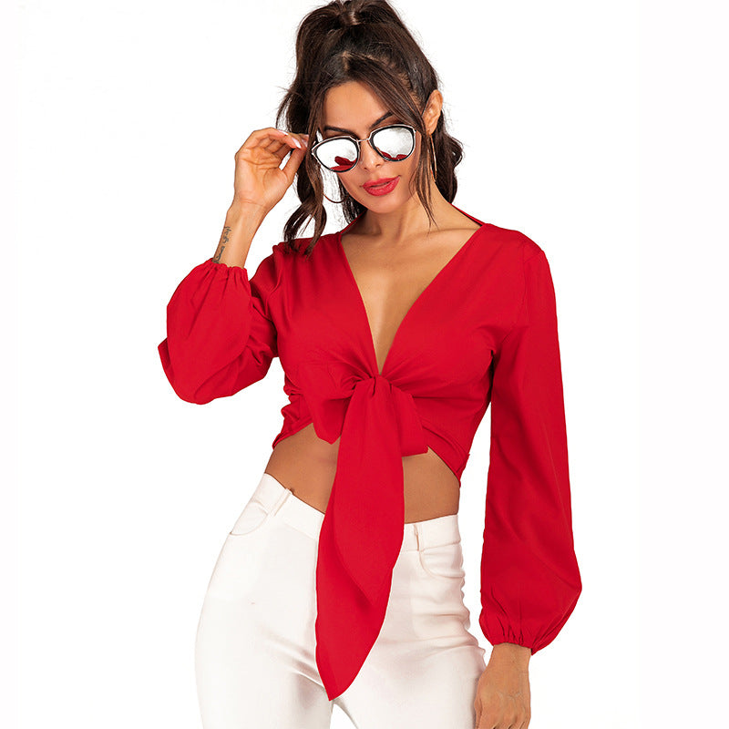 Steal the show when you walk in wearing the Women's Tie Waist Backless Crop Top with Long Sleeves. This stunning top comes in your choice of black, white or red.